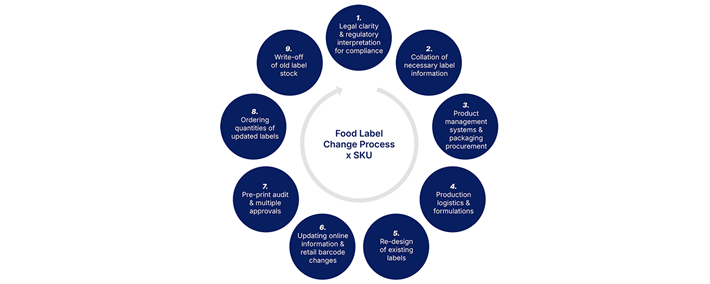 Food manufacturers usually initiate label updates every 18 months, although this can be as infrequent as every 5 years for certain products. Typically these are planned well in advance and are undertaken at scale on a ‘Stock Keeping Unit’ (SKU) basis. SKUs are unique codes used to identify and track individual products for inventory management.