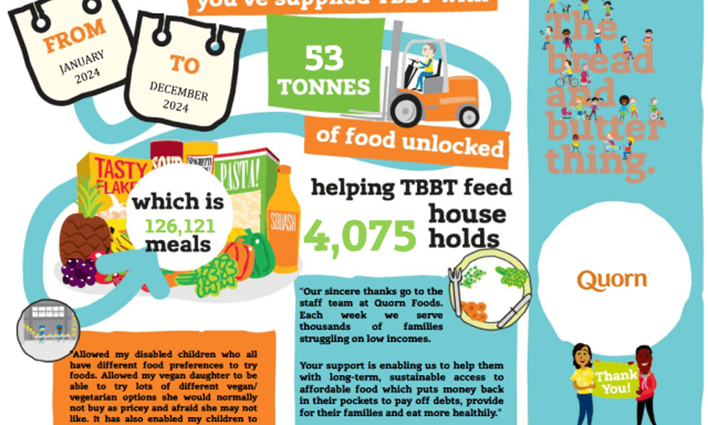 In 2024, Quorn Foods significantly improved its food redistribution programme by reducing warehouse food waste by 46% per tonne and achieving a 17% absolute reduction since 2019, while doubling its food donation target to provide two million nutritious portions of protein to people in need globally.